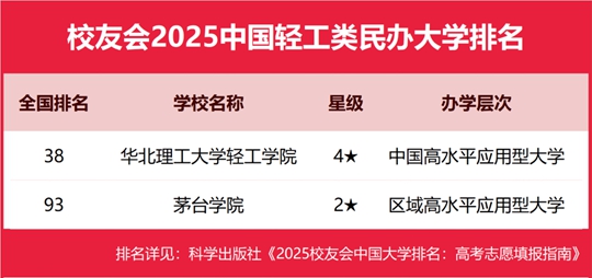 華北理工大學(xué)輕工學(xué)院位列2025中國(guó)輕工類民辦大學(xué)排名榜首,茅臺(tái)學(xué)院第二