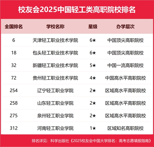 天津輕工職業(yè)技術(shù)學(xué)院勇奪2025中國(guó)輕工類高職院校排名第一,貴州輕工職業(yè)技術(shù)學(xué)院第四