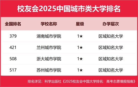 | 校友會(huì)2025中國(guó)城市類(lèi)大學(xué)排名,湖南城市學(xué)院、昆明城市學(xué)院、武漢城市職業(yè)學(xué)院第一 |