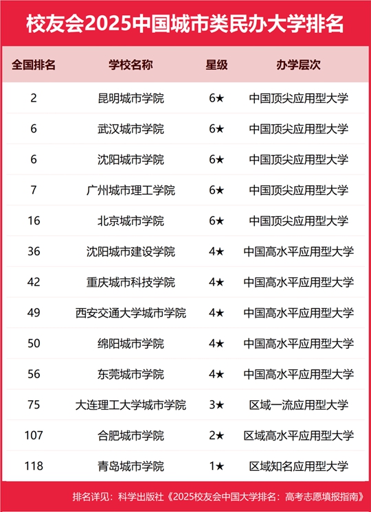 昆明城市學(xué)院位列2025中國(guó)城市類(lèi)民辦大學(xué)排名榜首,武漢城市學(xué)院、沈陽(yáng)城市學(xué)院前三