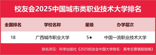 在校友會(huì)2025中國(guó)職業(yè)技術(shù)大學(xué)排名中,廣西城市職業(yè)大學(xué)全國(guó)排名第18名,穩(wěn)居校友會(huì)2025中國(guó)城市職業(yè)技術(shù)大學(xué)排名首位。