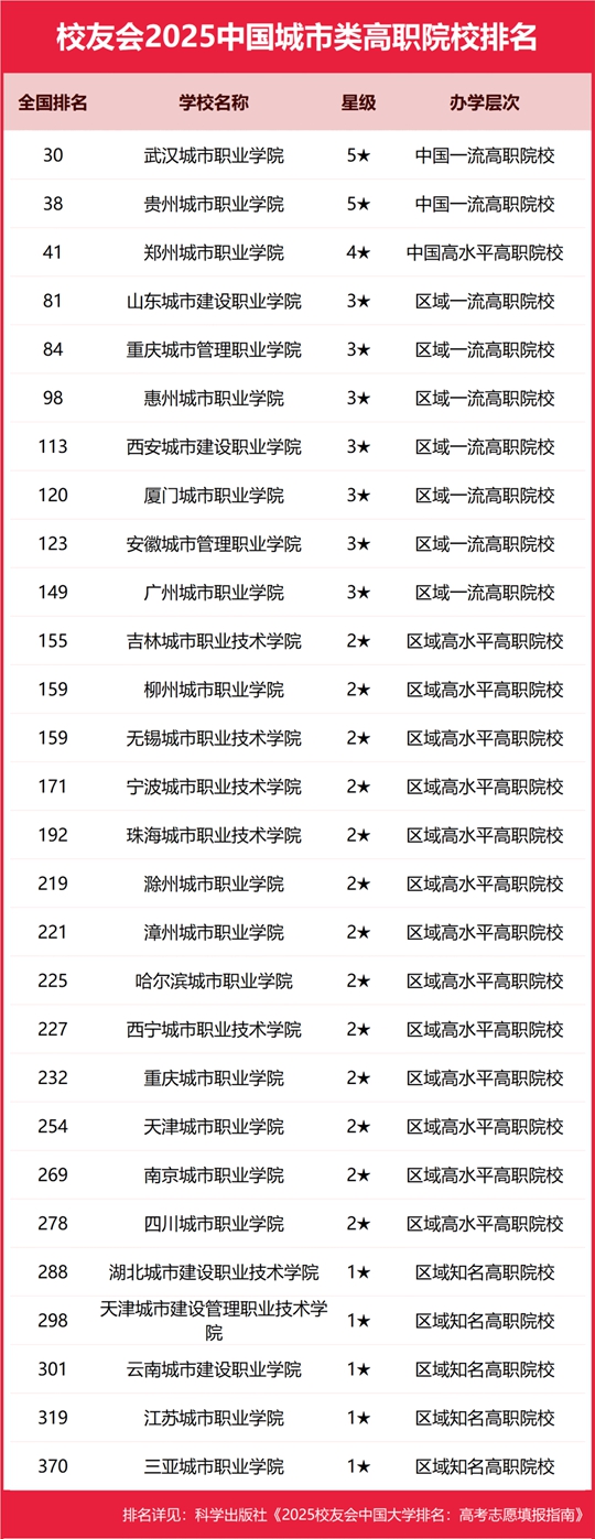 武漢城市職業(yè)學(xué)院勇奪2025中國(guó)城市類(lèi)高職院校排名第一,鄭州城市職業(yè)學(xué)院前三