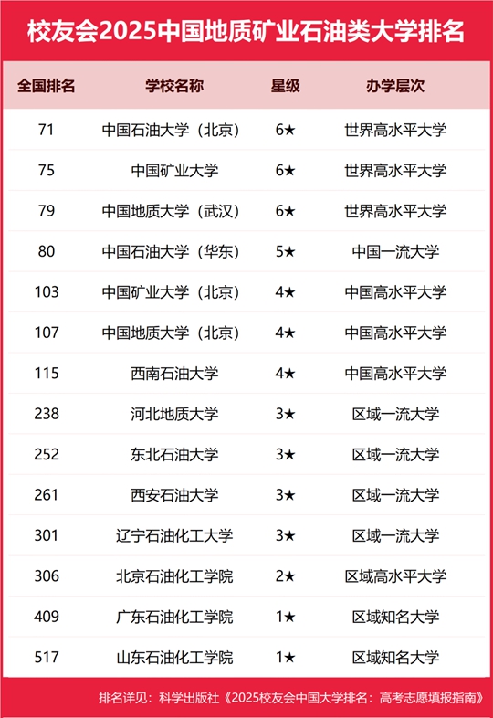 榜單顯示,在校友會(huì)2025中國(guó)大學(xué)排名中,中國(guó)石油大學(xué)(北京)院全國(guó)排名第71名,雄居校友會(huì)2025中國(guó)地質(zhì)礦業(yè)石油類(lèi)大學(xué)排名第一。中國(guó)礦業(yè)大學(xué)第二,中國(guó)地質(zhì)大學(xué)(武漢)第三,中國(guó)石油大學(xué)(華東)第四,中國(guó)礦業(yè)大學(xué)(北京)第五。