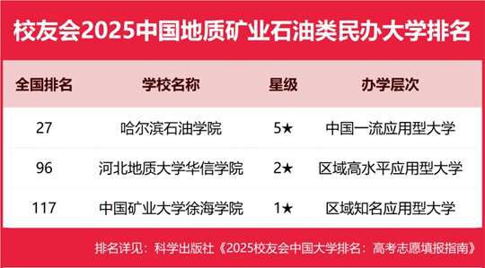 哈爾濱石油學(xué)院位列2025中國(guó)地質(zhì)礦業(yè)石油類(lèi)民辦大學(xué)排名榜首,河北地質(zhì)大學(xué)華信學(xué)院第二