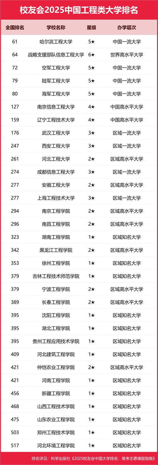榜單顯示,在校友會2025中國大學排名中,哈爾濱工程大學全國排名第61名,雄居校友會2025中國工程類大學排名第一。戰(zhàn)略支援部隊信息工程大學第二,空軍工程大學第三,陸軍工程大學第四,海軍工程大學第五。