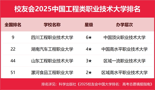 在校友會2025中國高職院校排名中,江西環(huán)境工程職業(yè)學院、陜西鐵路工程職業(yè)技術學院全國排名并列第30名,名列校友會2025中國城市高職院校排名冠軍。湖北生態(tài)工程職業(yè)技術學院第三,石家莊信息工程職業(yè)學院第四,黑龍江農(nóng)業(yè)工程職業(yè)學院第五。