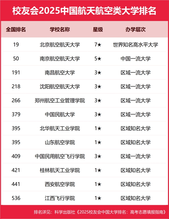 榜單顯示,在校友會2025中國大學(xué)排名中,北京航空航天大學(xué)全國排名第19名,雄居校友會2025中國航天航空類大學(xué)排名第一。南京航空航天大學(xué)第二,南昌航空大學(xué)第三,沈陽航空航天大學(xué)第四,鄭州航空工業(yè)管理學(xué)院第五。