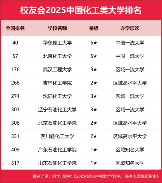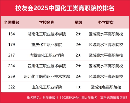| 校友會2025中國化工類大學(xué)排名,華東理工大學(xué)、湖南化工職業(yè)技術(shù)學(xué)院第一 |