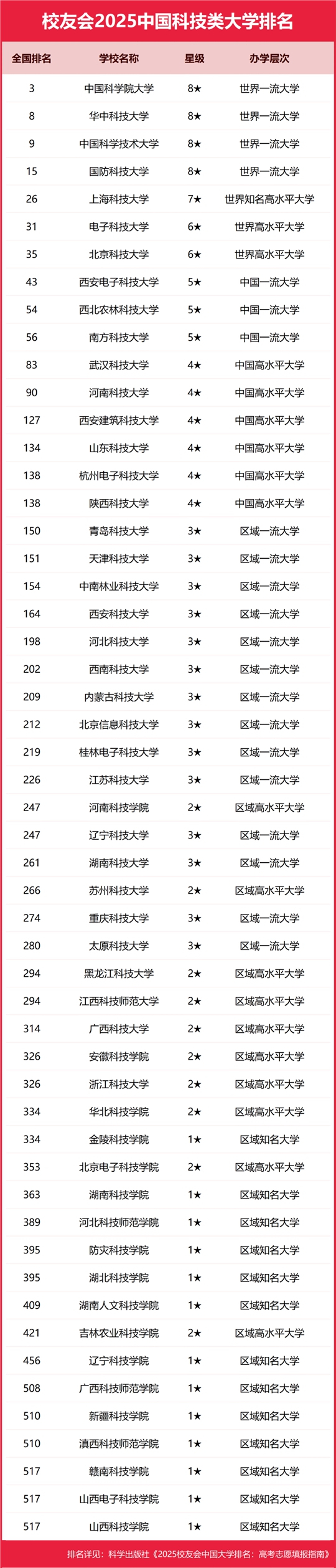 | 校友會2025中國科技類大學排名,中國科學院大學、廣東科技學院、江蘇農牧科技職業(yè)學院第一 |