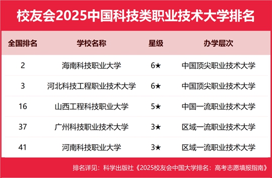 海南科技職業(yè)大學雄居2025中國科技類職業(yè)技術大學排名第一,河北科技工程職業(yè)技術大學第二