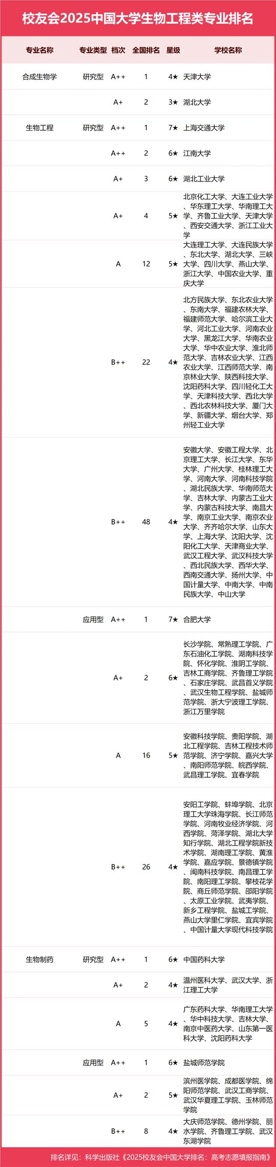 校友會2025中國大學(xué)生物工程類專業(yè)排名(應(yīng)用型)