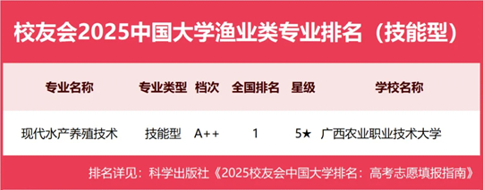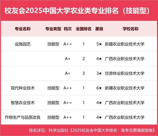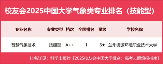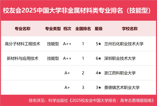 在校友會2025中國各類型大學(xué)一流專業(yè)排名(技能型)中,深圳職業(yè)技術(shù)大學(xué)、海南科技職業(yè)大學(xué)、廣東工商職業(yè)技術(shù)大學(xué)、成都藝術(shù)職業(yè)大學(xué)、浙江藥科職業(yè)大學(xué)、廣西農(nóng)業(yè)職業(yè)技術(shù)大學(xué)、山東外國語職業(yè)技術(shù)大學(xué)雄居2025中國綜合類、理工類、財(cái)經(jīng)類、藝術(shù)類、醫(yī)藥類、農(nóng)林類、語言類職業(yè)技術(shù)大學(xué)一流專業(yè)排名(技能型)第1。