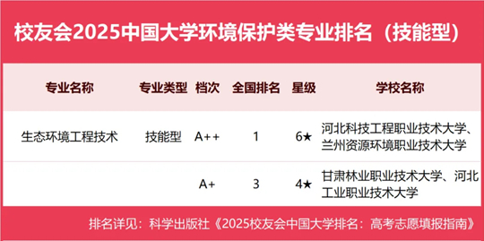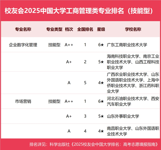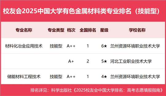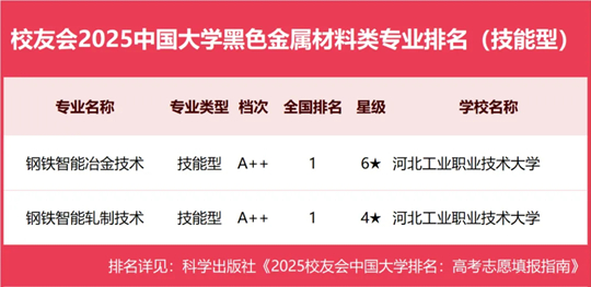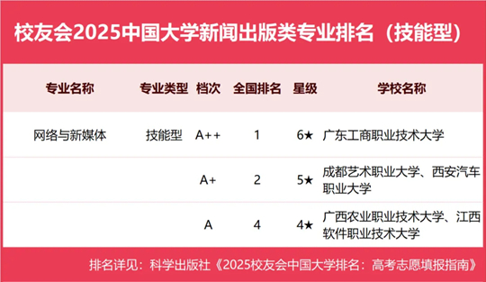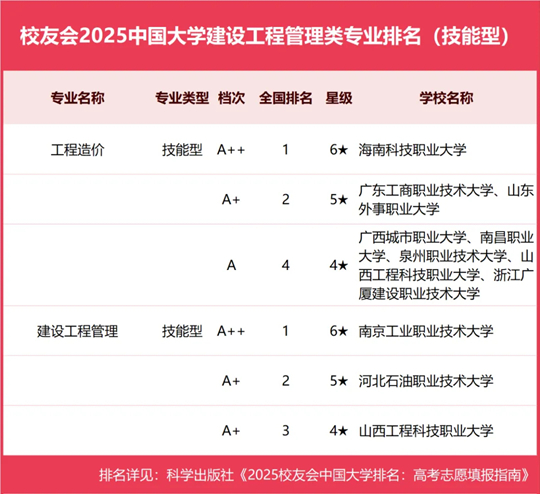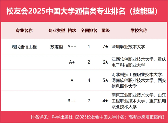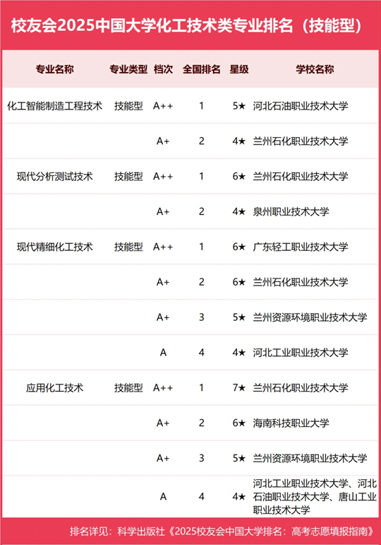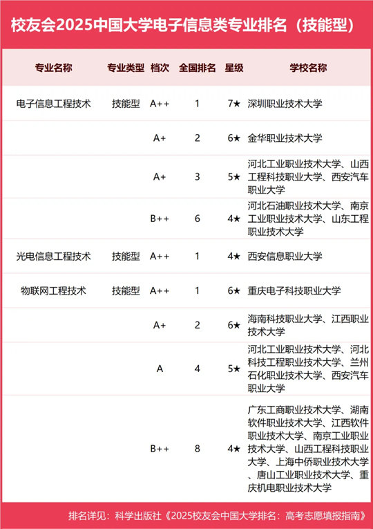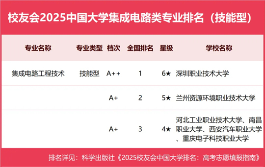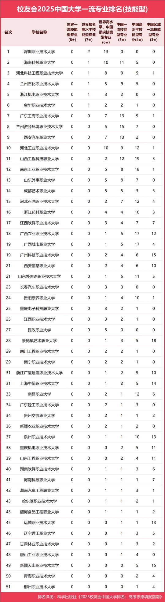 在校友會2025中國大學(xué)一流專業(yè)排名(技能型)中,深圳職業(yè)技術(shù)大學(xué)、海南科技職業(yè)大學(xué)、浙江機(jī)電職業(yè)技術(shù)大學(xué)、金華職業(yè)技術(shù)大學(xué)、河北科技工程職業(yè)技術(shù)大學(xué)、蘭州石化職業(yè)技術(shù)大學(xué)等48所高校的340個(gè)本科專業(yè)躋身2025年中國五星級(5★)以上技能型專業(yè)名單。