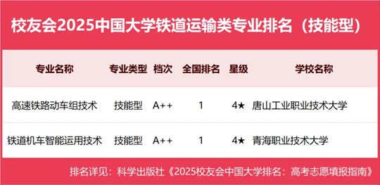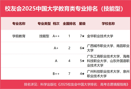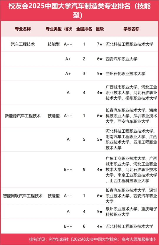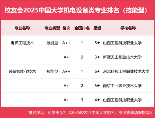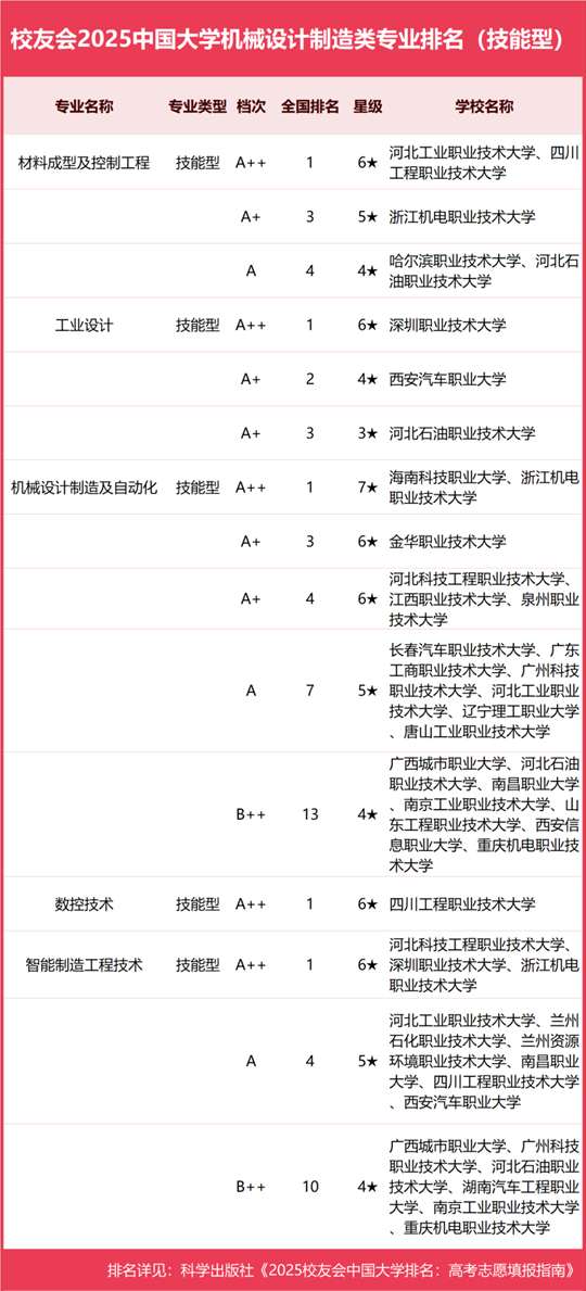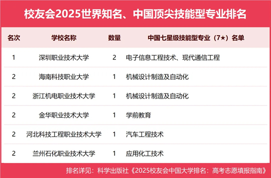 在校友會2025中國大學(xué)一流專業(yè)排名(技能型)中,深圳職業(yè)技術(shù)大學(xué)電子信息工程技術(shù)、海南科技職業(yè)大學(xué)機(jī)械設(shè)計(jì)制造及自動化、浙江機(jī)電職業(yè)技術(shù)大學(xué)機(jī)械設(shè)計(jì)制造及自動化、金華職業(yè)技術(shù)大學(xué)學(xué)前教育、河北科技工程職業(yè)技術(shù)大學(xué)汽車工程技術(shù)、蘭州石化職業(yè)技術(shù)大學(xué)應(yīng)用化工技術(shù)等7個(gè)本科專業(yè)榮獲2025中國七星級技能型專業(yè)(7★),躋身世界知名、中國頂尖技能型專業(yè)行列。