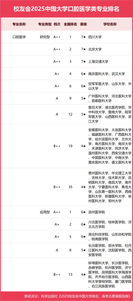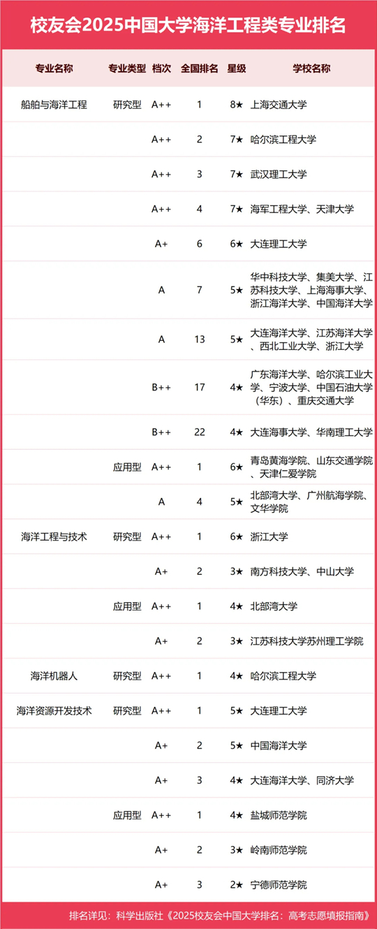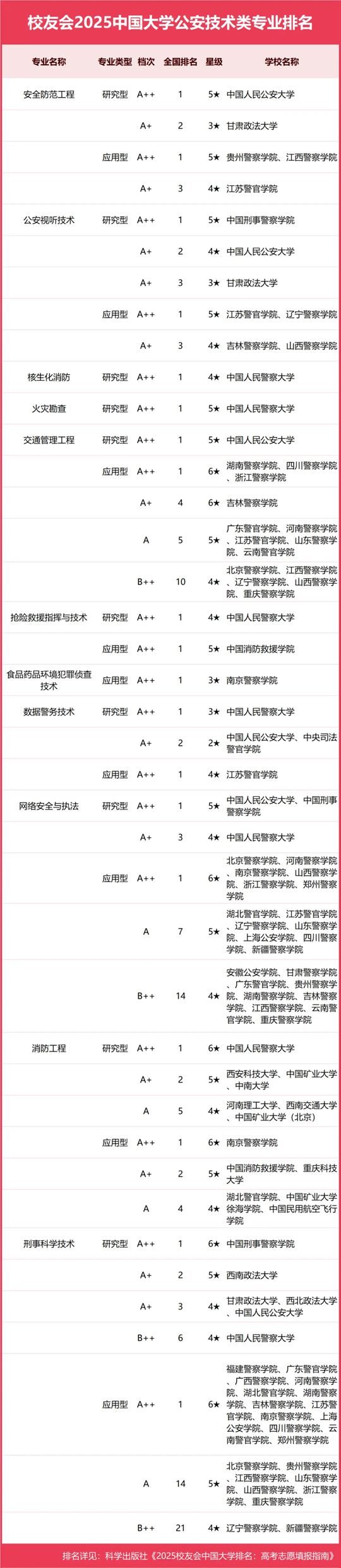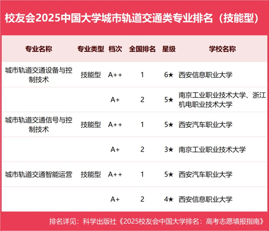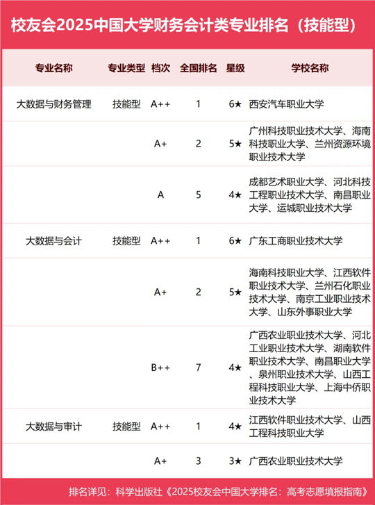 校友會2025中國大學(xué)一流專業(yè)排名堅(jiān)持實(shí)施分類分級分檔評價(jià),依據(jù)中國大學(xué)辦學(xué)定位、學(xué)科專業(yè)建設(shè)水平和本科專業(yè)發(fā)展定位,按研究型、應(yīng)用型和技能型3個(gè)類型進(jìn)行分類評價(jià),首次發(fā)布中國大學(xué)一流專業(yè)排名(技能型)暨中國職業(yè)技術(shù)大學(xué)專業(yè)排名。校友會中國大學(xué)專業(yè)分檔評價(jià)依據(jù)中國大學(xué)專業(yè)排名位次、位次百分比、星級排名,將中國大學(xué)本科專業(yè)分為A++、A+、A、B++、B+、B、C和D等8個(gè)檔次。