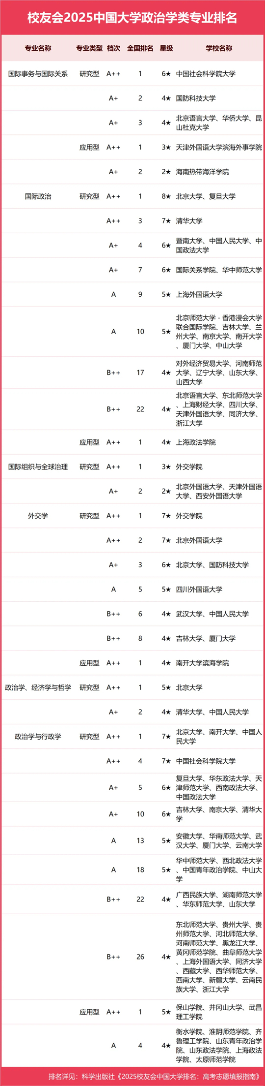 在校友會2025中國大學(xué)一流專業(yè)排名(研究型)中,北京大學(xué)物理學(xué)、清華大學(xué)電子科學(xué)與技術(shù)、中國科學(xué)院大學(xué)材料科學(xué)與工程、中國人民大學(xué)法學(xué)、中國社會科學(xué)院大學(xué)漢語言文學(xué)、復(fù)旦大學(xué)國際政治、浙江大學(xué)農(nóng)業(yè)資源與環(huán)境、南開大學(xué)數(shù)學(xué)與應(yīng)用數(shù)學(xué)、中國科學(xué)技術(shù)大學(xué)物理學(xué)、華中科技大學(xué)機(jī)械設(shè)計(jì)制造及其自動化、上海交通大學(xué)船舶與海洋工程、中南大學(xué)冶金工程、哈爾濱工業(yè)大學(xué)焊接技術(shù)與工程、國防科技大學(xué)計(jì)算機(jī)科學(xué)與技術(shù)、上?萍即髮W(xué)材料科學(xué)與工程、西湖大學(xué)生物科學(xué)等65個(gè)本科專業(yè)榮膺2025中國八星級專業(yè)(8★),躋身世界一流專業(yè)、中國最頂尖專業(yè)行列,代表中國大學(xué)本科專業(yè)教育的最高水平,是2025年立志成長為未來政商學(xué)界等行業(yè)領(lǐng)袖、頂尖人才的中國高考最優(yōu)秀考生的首選專業(yè)。