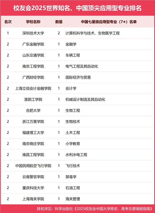 在校友會2025中國大學(xué)一流專業(yè)排名(應(yīng)用型)中,深圳技術(shù)大學(xué)計(jì)算機(jī)科學(xué)與技術(shù)、合肥大學(xué)生物工程、重慶科技大學(xué)石油工程、廣東金融學(xué)院金融學(xué)、南京工程學(xué)院電氣工程及其自動化、山東交通學(xué)院車輛工程、廣西財(cái)經(jīng)學(xué)院國際經(jīng)濟(jì)與貿(mào)易、上海立信會計(jì)金融學(xué)院會計(jì)學(xué)、中國民用航空飛行學(xué)院飛行技術(shù)、南昌工程學(xué)院水利水電工程、淮陰工學(xué)院機(jī)械設(shè)計(jì)制造及其自動化、福建理工大學(xué)土木工程、南京曉莊學(xué)院小學(xué)教育、云南警官學(xué)院禁毒學(xué)、浙江萬里學(xué)院生物技術(shù)、上海海關(guān)學(xué)院海關(guān)管理等17個(gè)本科專業(yè)榮獲2025中國七星級應(yīng)用型專業(yè)(7★),躋身世界知名、中國頂尖應(yīng)用型專業(yè)行列。