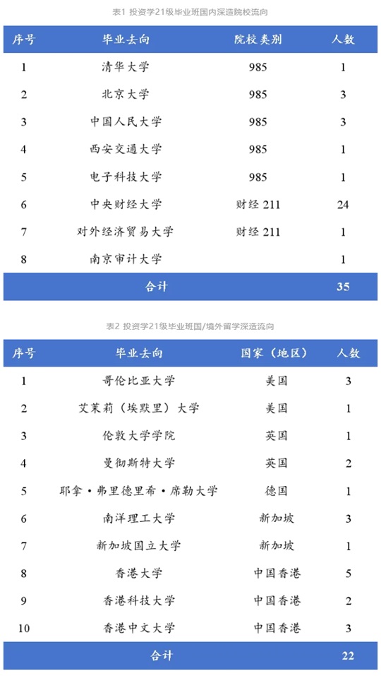 四度春秋磨礪,收獲累累碩果。中央財(cái)經(jīng)大學(xué)投資學(xué)專(zhuān)業(yè)2021級(jí)畢業(yè)班同學(xué)們銳意進(jìn)取、奮力拼搏,學(xué)習(xí)于課堂之上,鍛煉于實(shí)踐之間,積極擁抱數(shù)字創(chuàng)新、交叉融合的時(shí)代浪潮,踴躍踐行經(jīng)世濟(jì)民、財(cái)菁強(qiáng)國(guó)的青年使命,以?xún)?yōu)異的成績(jī)與全面的成長(zhǎng),交出又一份畢業(yè)季亮眼答卷。截止目前,已有35位同學(xué)確定國(guó)內(nèi)升學(xué)深造,22位同學(xué)確定國(guó)/境外留學(xué)深造,畢業(yè)深造率為73.08%。國(guó)內(nèi)深造高校涵蓋了包括清華大學(xué)、北京大學(xué)、中國(guó)人民大學(xué)、西安交通大學(xué)、電子科技大學(xué)、中央財(cái)經(jīng)大學(xué)、對(duì)外經(jīng)濟(jì)貿(mào)易大學(xué)在內(nèi)的國(guó)內(nèi)知名高校(見(jiàn)表1);國(guó)/境外留學(xué)高校涵蓋了包括哥倫比亞大學(xué)、曼徹斯特大學(xué)、新加坡國(guó)立大學(xué)、南洋理工大學(xué)等在內(nèi)的國(guó)際知名高校(見(jiàn)表2)。