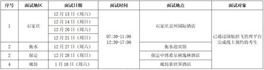 (二)預(yù)選初檢:登錄“國航招飛管理平臺(tái)”填寫信息、預(yù)約場(chǎng)次,已預(yù)約考生嚴(yán)格按照預(yù)約時(shí)間參加國航招飛辦公室組織的現(xiàn)場(chǎng)初檢面試(含飛行職業(yè)能力傾向測(cè)試、英語測(cè)試、面試等);