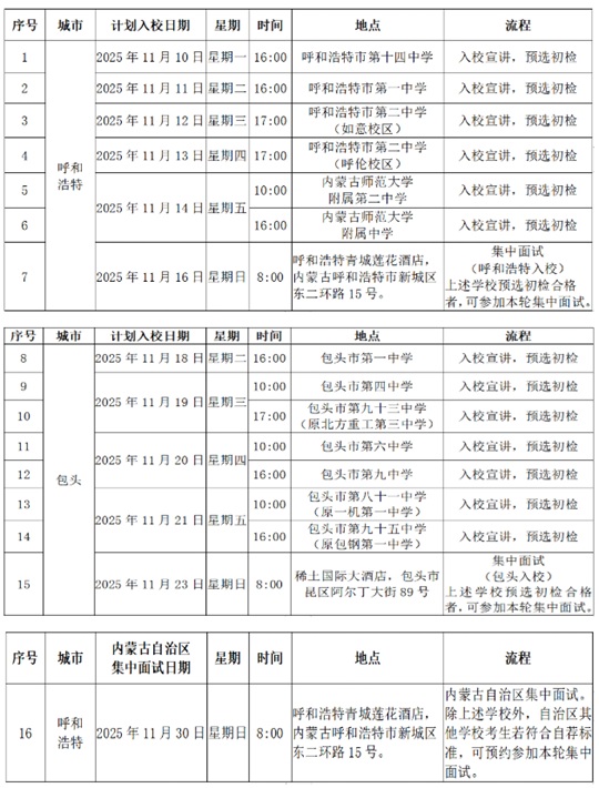 2.未參加入校預(yù)選初檢的考生,需按照規(guī)定預(yù)約參加國航招飛辦公室組織的內(nèi)蒙古自治區(qū)集中面試(包含預(yù)選初檢、飛行職業(yè)能力傾向測試、英語測試、面試等項目),具體日程安排詳見本簡章“四、初檢面試安排”中“(一)日程安排”的第16條。