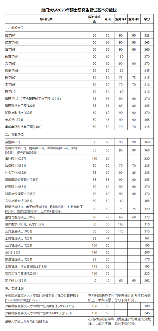 | 廈門大學(xué)2023年碩士研究生復(fù)試基本分?jǐn)?shù)線 |