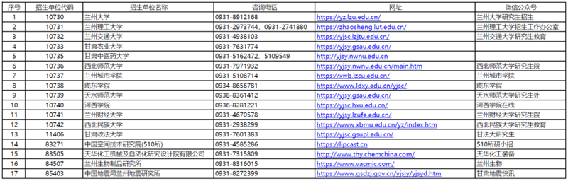 甘肅省2026年全國(guó)碩士研究生招生考試各招生單位聯(lián)系方式