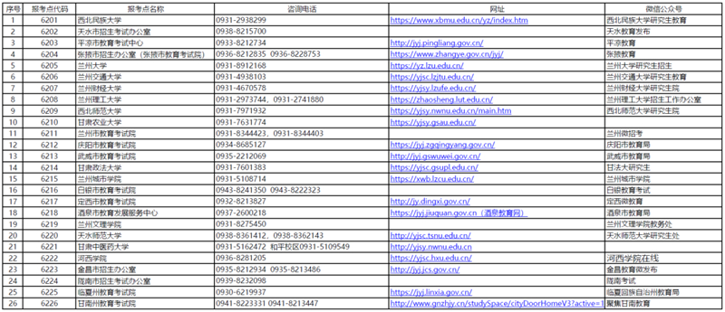 甘肅省2026年全國(guó)碩士研究生招生考試各報(bào)考點(diǎn)聯(lián)系方式