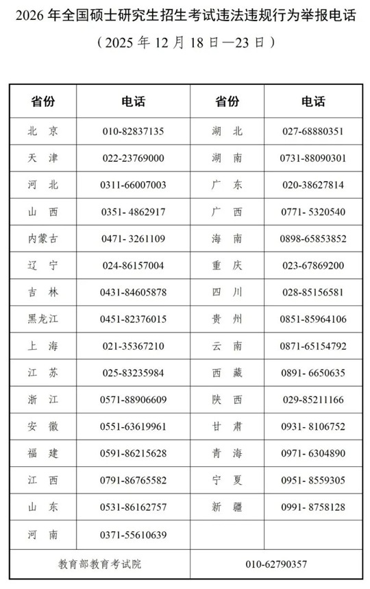 現(xiàn)向社會公布2026年全國碩士研究生招生考試違法違規(guī)行為舉報電話,歡迎廣大考生和公眾參與監(jiān)督。