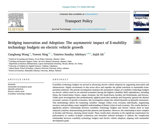 近日,西安培華學(xué)院會計與金融學(xué)院王倉紅博士作為第一作者、學(xué)院為第一署名單位的研究成果《Bridging innovation and Adoption: The asymmetric impact of E-mobility technology budgets on electric vehicle growth》在SSCI收錄的國際學(xué)術(shù)期刊《Transport Policy》正式發(fā)表。該期刊位列JCR分區(qū)一區(qū)、中國科學(xué)院分區(qū)一區(qū)Top期刊,2025年影響因子5.3分。