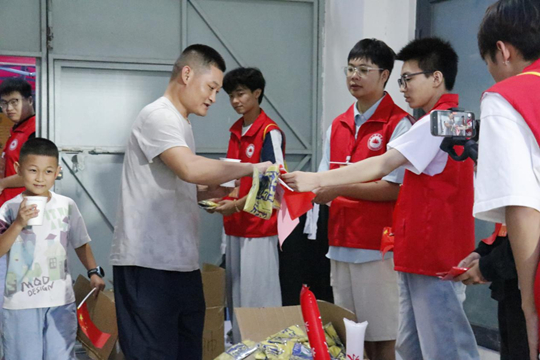 在體育場(chǎng)各入口處的物資分發(fā)點(diǎn),志愿者們忙碌地為觀眾發(fā)放小紅旗、應(yīng)援棒及雨衣等物品。這些小小的物資迅速點(diǎn)燃了現(xiàn)場(chǎng)熱情,大家揮舞紅旗、吶喊助威,讓國(guó)慶的喜慶與足球的激情交相輝映。