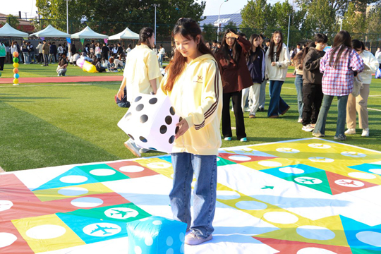 本次活動聯動各二級學院,精心構筑三大心理成長路徑,系統(tǒng)整合七大板塊內容,引領學生在沉浸式體驗中探索自我、滋養(yǎng)心靈。團隊協作區(qū)設有“合力建塔”“大型撲克牌”等項目,引導學生在溝通與配合中建立信任,從集體勝利中獲取深層歸屬感與快樂;思維挑戰(zhàn)區(qū)包含“智拼七巧板”“地面飛行棋”“大富翁”等智力比拼項目,激發(fā)學生在解決問題中迸發(fā)靈感,從突破自我中獲得成就與興奮;活力釋放區(qū)則通過“跳舞毯”“快樂抖球”“禮射”“沙包”等藝術與競技活動,鼓勵學生盡情舒展身心,在專注與律動中喚醒身體能量,在歡笑與挑戰(zhàn)中自然激活積極情緒,釋放多巴胺神經遞質,真正實現“在玩中學、在樂中長”。