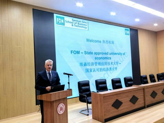 講座中,Andreas Stoffers教授圍繞FOM大學的課程體系與核心優(yōu)勢展開分享。他詳細介紹了該校在應用型人才培養(yǎng)方面的特色課程設計,以及與行業(yè)接軌的教學模式,讓在場師生對德國高等教育的實踐導向有了直觀認識。