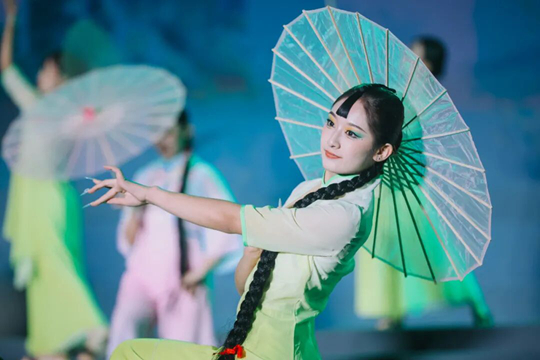 民舞團的舞者撐著透明油紙傘輕盈舞動,將古典意境里雨打芭蕉的柔與靈,具象成指尖的婉轉以及裙擺的輕搖。