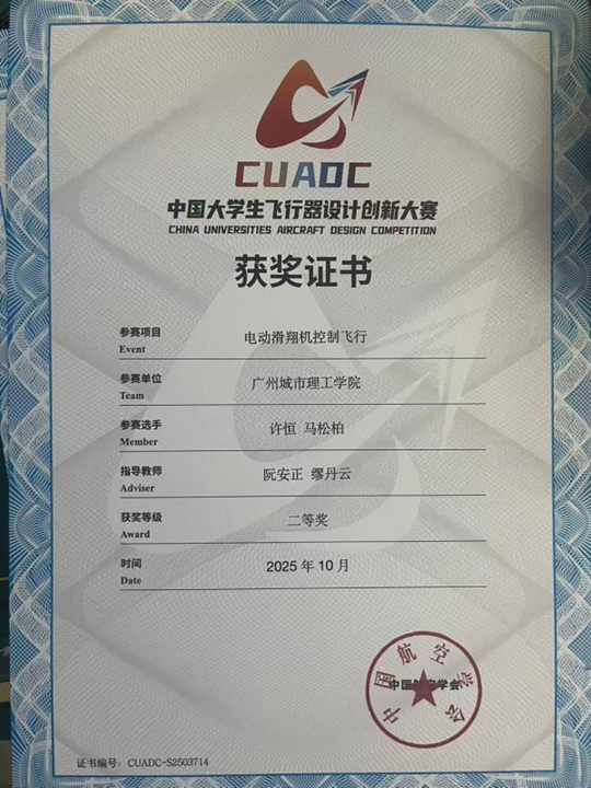 10月8日至13日,2025中國大學生飛行器設計創(chuàng)新大賽(CUADC)全國總決賽在浙江莫干山機場舉行。廣州城市理工學院機械工程學院/機器人工程學院“無疆航模隊”憑借扎實的技術積累、日夜兼程的鉆研與賽場上的出色發(fā)揮,從全國150余所高校的競爭中脫穎而出,斬獲全國電動滑翔機控制飛行項目二等獎、限時載運飛行項目三等獎兩項殊榮。