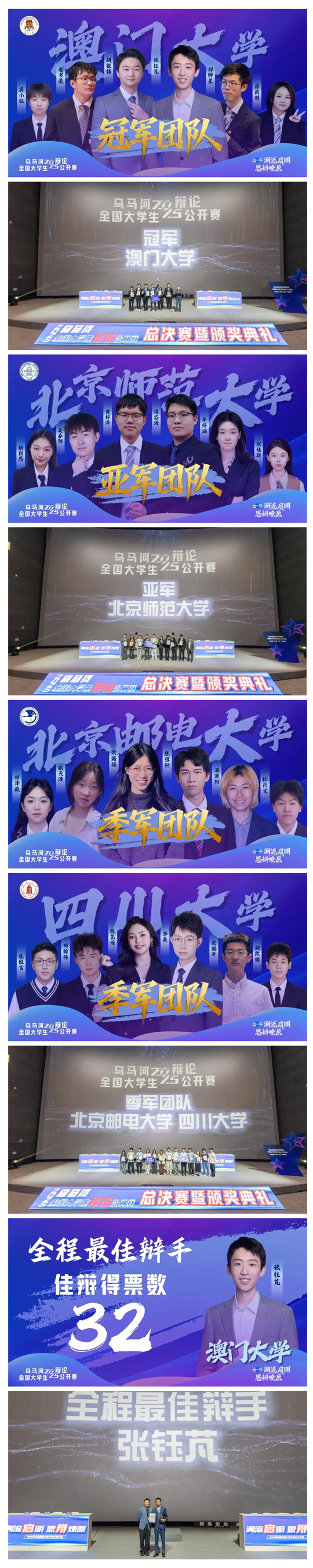 最終澳門大學(xué)辯論隊力壓群雄,摘得2025烏馬河·全國大學(xué)生辯論公開賽冠軍,其隊明星辯手張鈺芃斬獲全程最佳辯手。北京師范大學(xué)獲得亞軍,北京郵電大學(xué)與四川大學(xué)并列季軍。