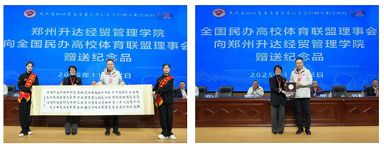儀式現(xiàn)場(chǎng),鄭州升達(dá)經(jīng)貿(mào)管理學(xué)院校長(zhǎng)張欣與全國(guó)民辦高校體育聯(lián)盟理事長(zhǎng)姜波博士互贈(zèng)紀(jì)念品。這份互贈(zèng)不僅承載著升達(dá)學(xué)院對(duì)聯(lián)盟的誠(chéng)摯謝意,更凝聚了雙方深化合作、共促民辦高校體育教育發(fā)展的美好愿景。