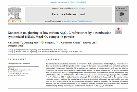 在深耕材料科學領域五年的時間中,她的成果不斷獲得行業(yè)認可。讓鄭欣倍感溫暖與鼓舞的是,加入培華后,學校對科研工作給予了全力支持,為她搭建了施展專業(yè)才華的廣闊舞臺。今年帶領團隊在國際材料領域SCIE期刊《Ceramics International》發(fā)表題為《Nanoscale toughening of low-carbon Al₂O₃-C refractories by a combustion synthesized BNNSs/MgAl₂O₄ composite powder》的學術論文。這一期刊創(chuàng)刊于1971年,由Elsevier Ltd出版,在中國科學院分區(qū)中屬材料科學大類2區(qū),為材料科學權威Top期刊,影響因子5.6,是國際公認的材料科學權威刊物之一。