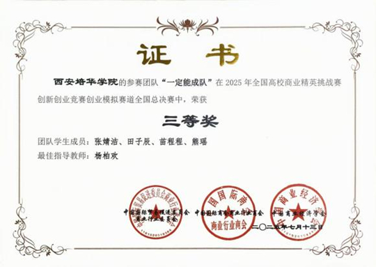 為響應(yīng)國家支持大學(xué)生創(chuàng)新創(chuàng)業(yè)的號召,提升學(xué)生創(chuàng)新實踐能力,西安培華學(xué)院積極組織學(xué)生參加2025年全國高校商業(yè)精英挑戰(zhàn)賽創(chuàng)新創(chuàng)業(yè)競賽“精創(chuàng)教育杯”創(chuàng)業(yè)模擬賽道比賽,最終兩支隊伍在全國總決賽中分別榮獲一等獎和三等獎。