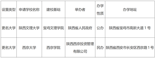根據(jù)《中華人民共和國高等教育法》《普通高等學校設置暫行條例》《普通本科學校設置暫行規(guī)定》等有關規(guī)定,經(jīng)陜西省高等學校設置評議委員會考察和評議,現(xiàn)對擬向教育部申報的“寶雞文理學院更名陜西文理大學”“西京學院更名西京大學”事項予以公示,接受社會監(jiān)督。