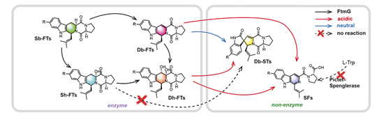 天然產(chǎn)物一直以來都是藥物的重要來源,吲哚生物堿因其多樣的結(jié)構(gòu)和廣泛的生物活性(如抗菌、抗腫瘤、抗病毒等)而備受關(guān)注。其中,β-carboline(βCs)和spirotryprostatins(STs)兩類天然吲哚分子的生物合成途徑研究相對較少。βCs只有3種Pictet–Spengler骨架形成酶有報道,同時STs僅知FqzB/FtmG與螺環(huán)形成有關(guān)且部分假說缺乏實驗佐證,而且pH等環(huán)境因子如何驅(qū)動其結(jié)構(gòu)多樣性亦未闡明。