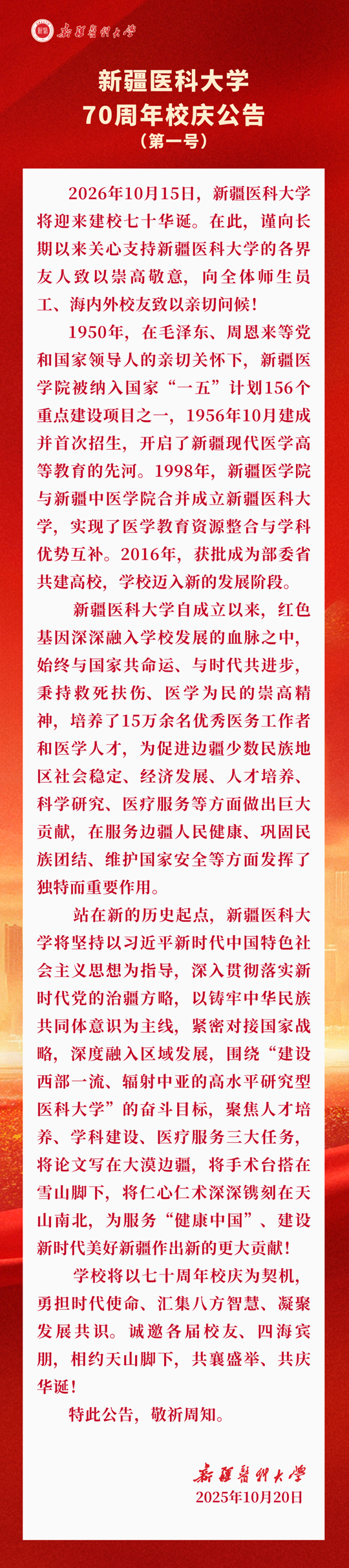 新疆醫(yī)科大學(xué)70周年校慶公告(第一號(hào))