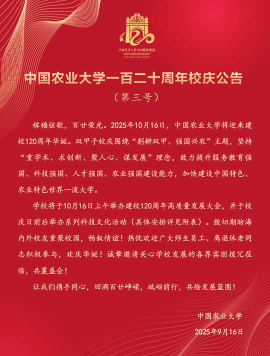 中國農(nóng)業(yè)大學(xué)一百二十周年校慶公告(第三號)