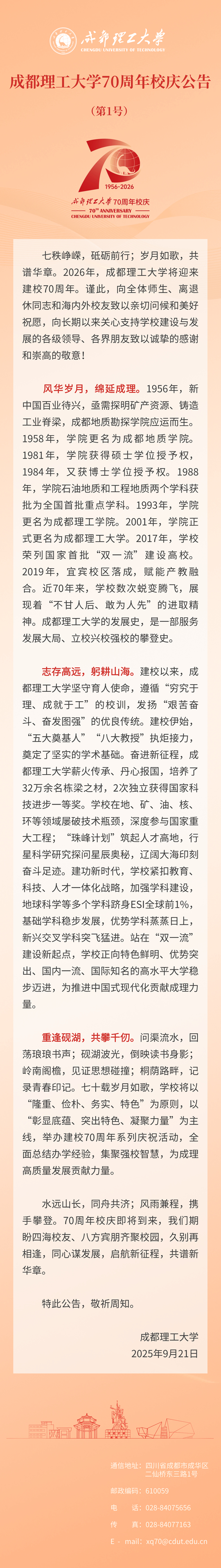 成都理工大學(xué)70周年校慶公告(第1號(hào))