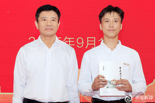 奏唱國歌后,李明為2025級新生代表佩戴;詹㈩C贈校史。學(xué)校將為每一名新同學(xué)頒發(fā)刻有姓名和學(xué)號的;眨瑸槊恳粋新生班配備《人物卷》校史,希望同學(xué)們以百年海大先賢為榜樣,傳承海大精神,不負時代期許。