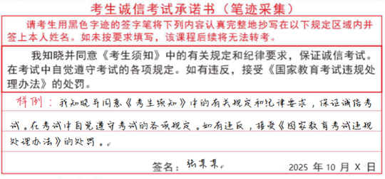 1.落實(shí)筆跡信息采集要求。考生應(yīng)在答題卡指定區(qū)域完整抄寫《考生誠信考試承諾書》并簽名(抄寫樣例如下圖),省教育考試院將采集此處的抄寫內(nèi)容作為考生筆跡信息,并隨課程成績記入考生考籍檔案。